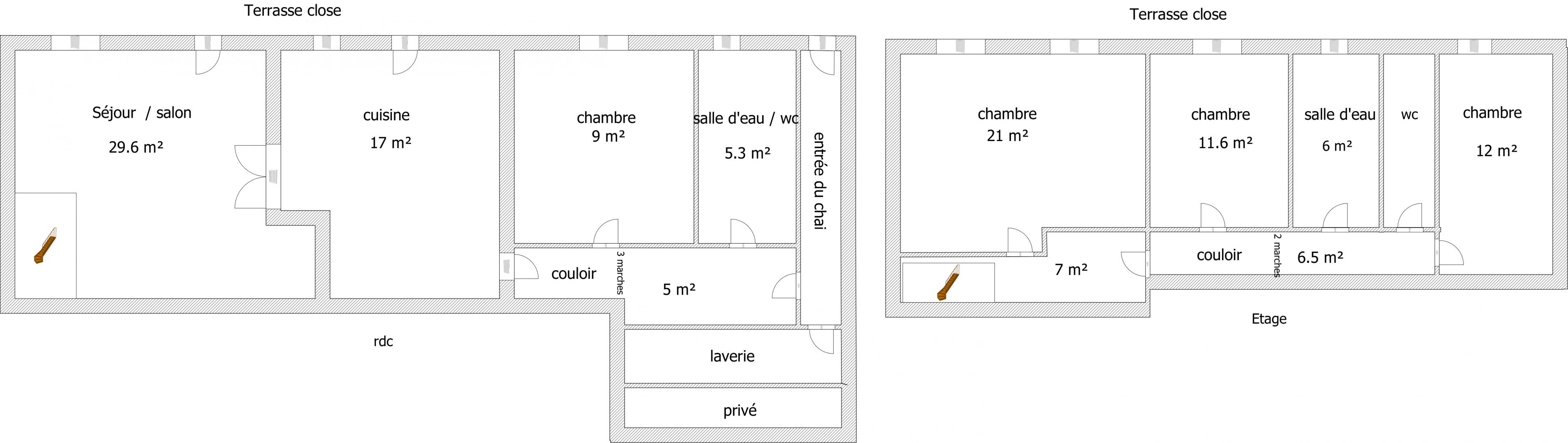 - Terrasse close privative sur terrain clos commun avec le voisin (servitude de passage). Possibilité d'y garer une voiture.